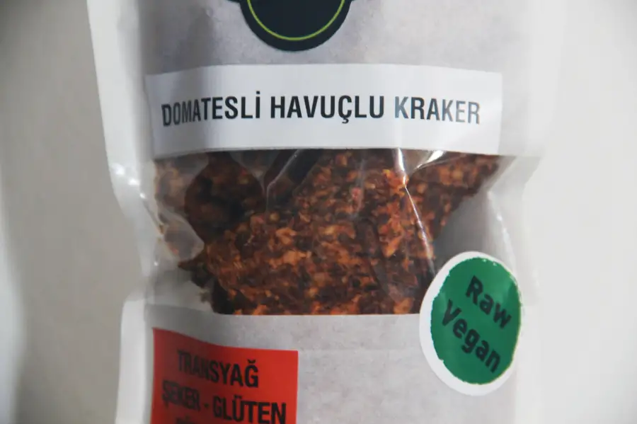 Domatesli Havuçlu Kraker : Badem, Fındık, Keten Tohumu, Domates, Havuç, Soğuk Sıkım Zeytinyağı, Kekik, Deniz Tuzu Alerjenler: Badem, Domates, eser miktarda fındık içerebilir.
